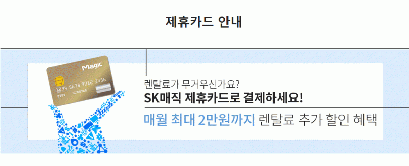 SK매직 만원할인 제휴카드안내 2020-02-27 제품 상담문의 : 1600-2631 SK매직 주요 고객사 생활의 SK매직, 지속적인 품질의 고급화와 기술력 혁신을 통하여 글로벌 기업으로서 비전을 실현해가고 있습니다. 1811-0842 고객님께 가장 알맞은 제품으로친절하게 상담드리겠습니다.